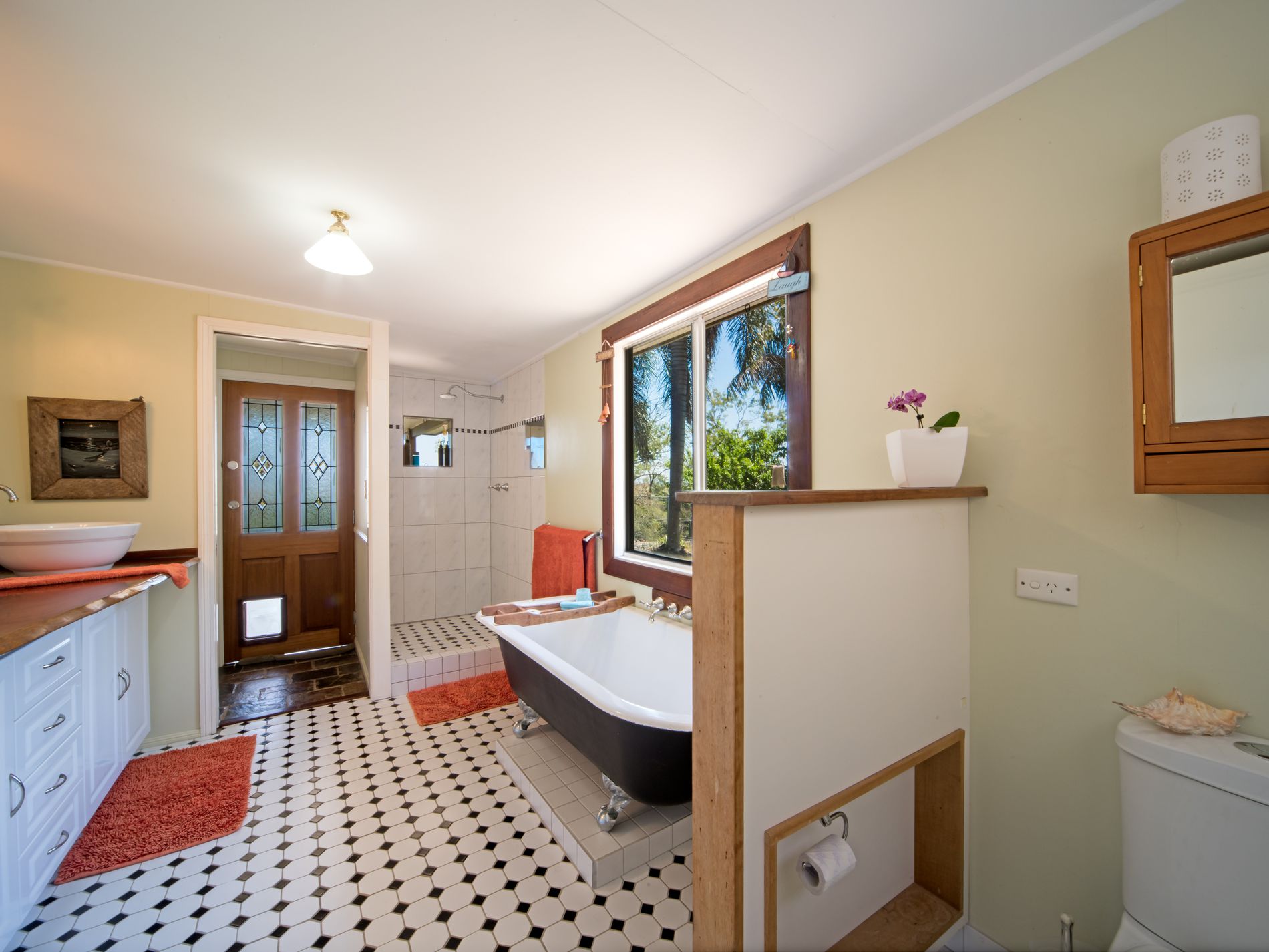 Inside you are greeted by stunning slate floors in the large open plan living/dining/kitchen complete with polished timber kitchen tops and breakfast bar. The 4 bedrooms have hardwood floors and 3 are queen sized bedrooms and 1 single bedroom. All tied together with a black and white theme bathroom with claw foot bath.