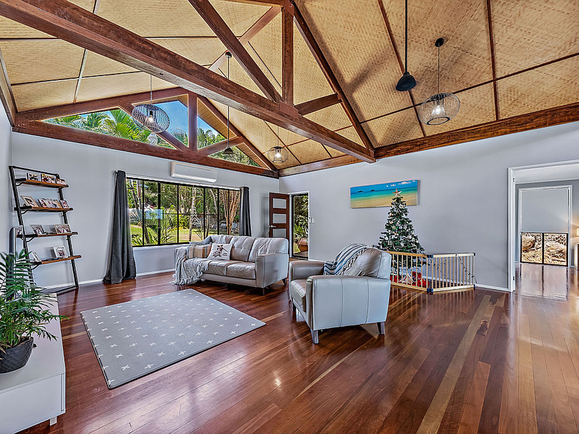- Balinese style exposed wood beams and rattan fans upstairs
