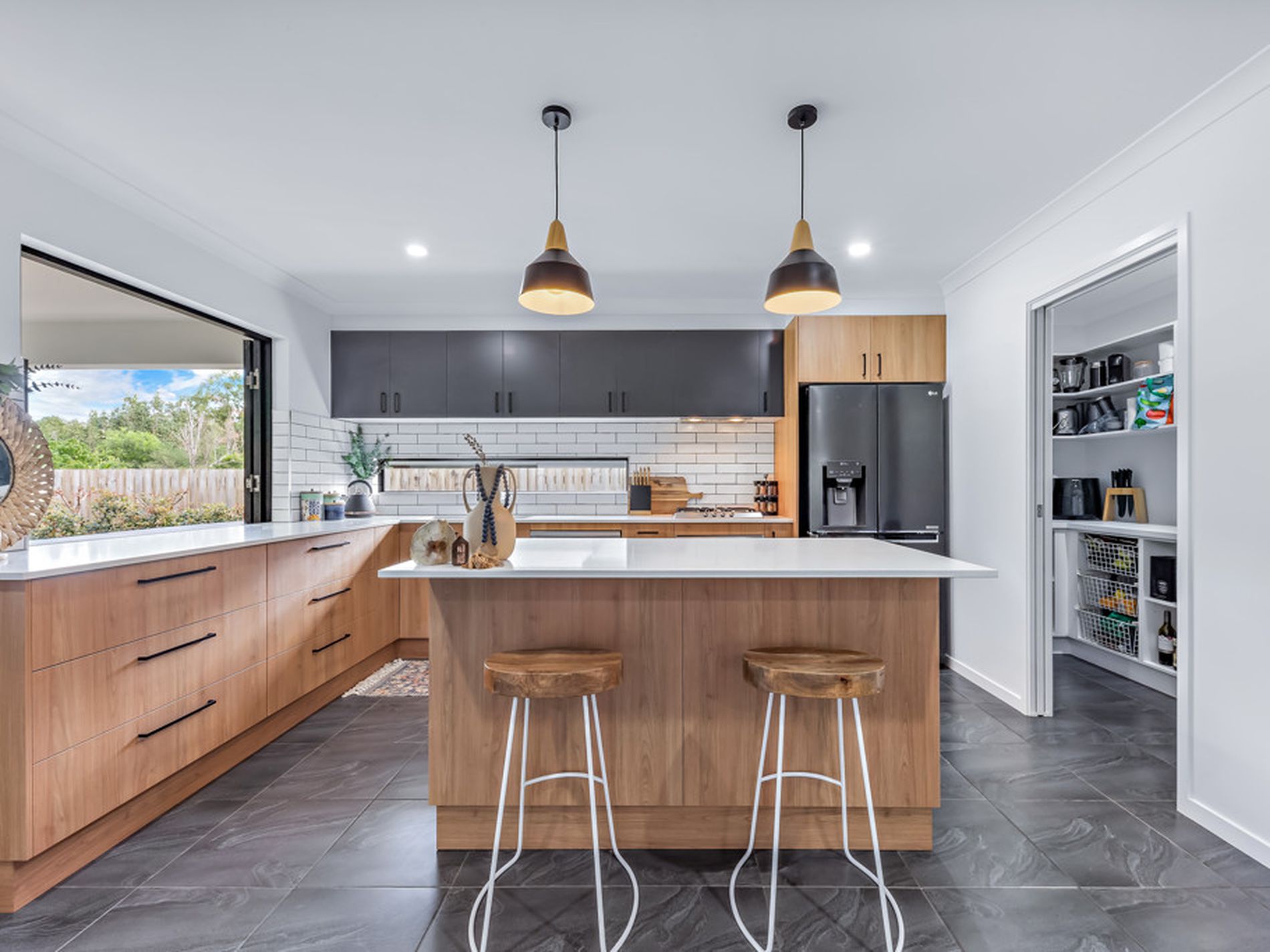 One of my favourite features of the home is the kitchen to outdoor entertaining area servery window, complete with red gum wood-slab bar, television and fire pit area.