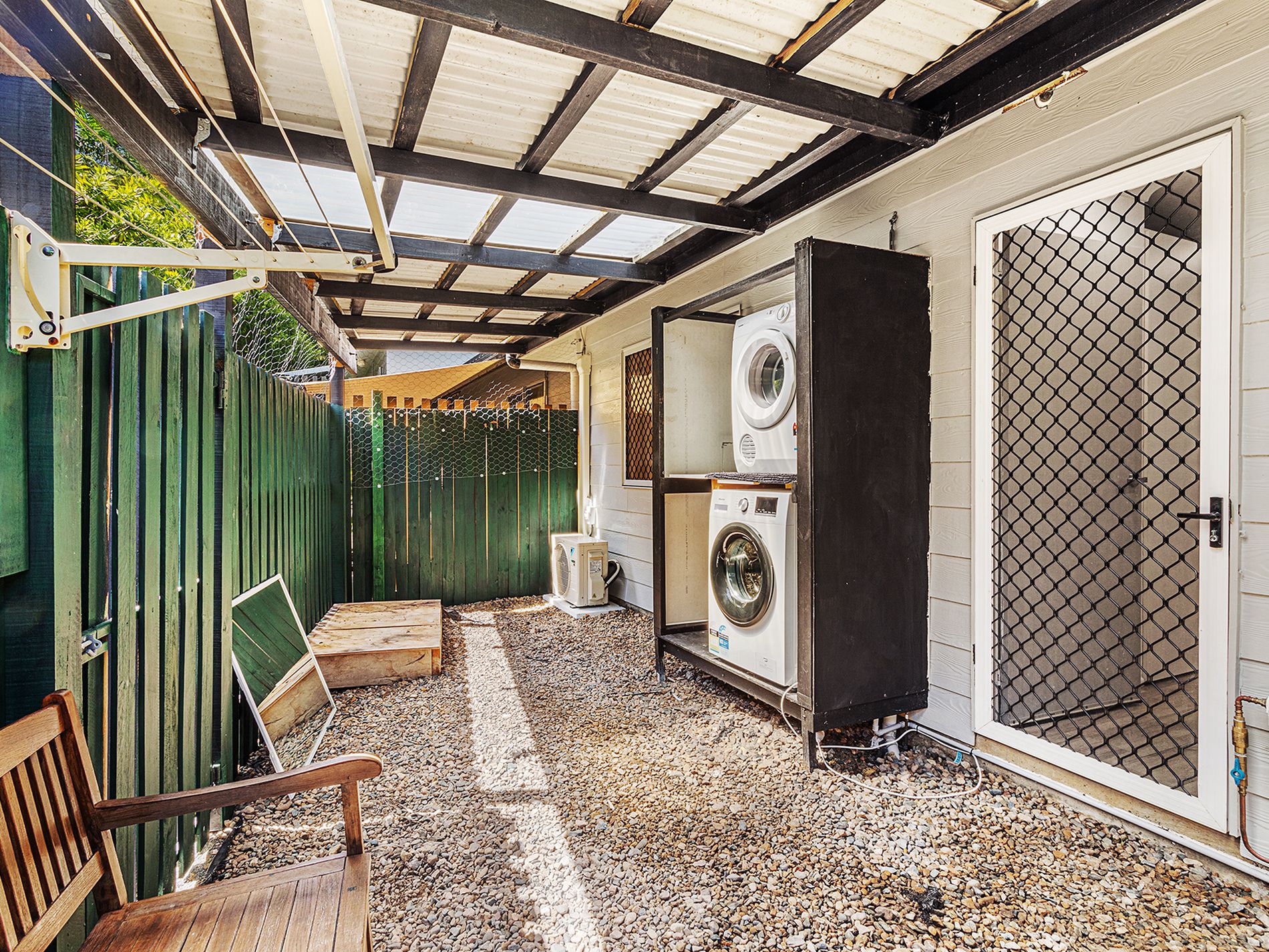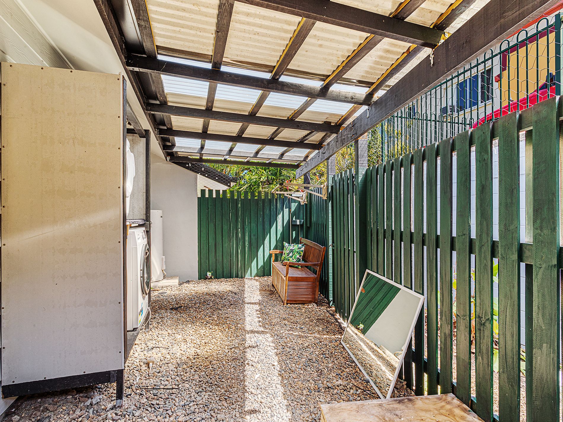 Outdoor Area and Patio: The unit has an all-weather courtyard at the rear, approx. 3.2m x 6.6m. At the front of the home is another private deck area with shade sail overhead.