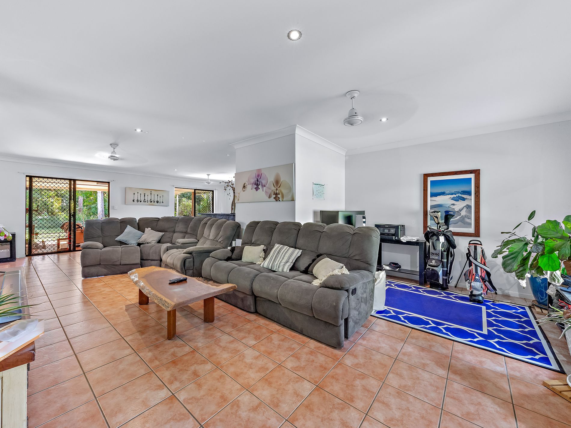 The open plan kitchen, living and dining area leads out to a large alfresco area and lawned gardens.