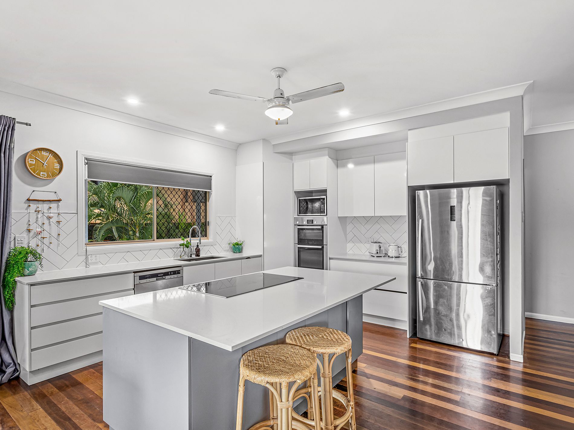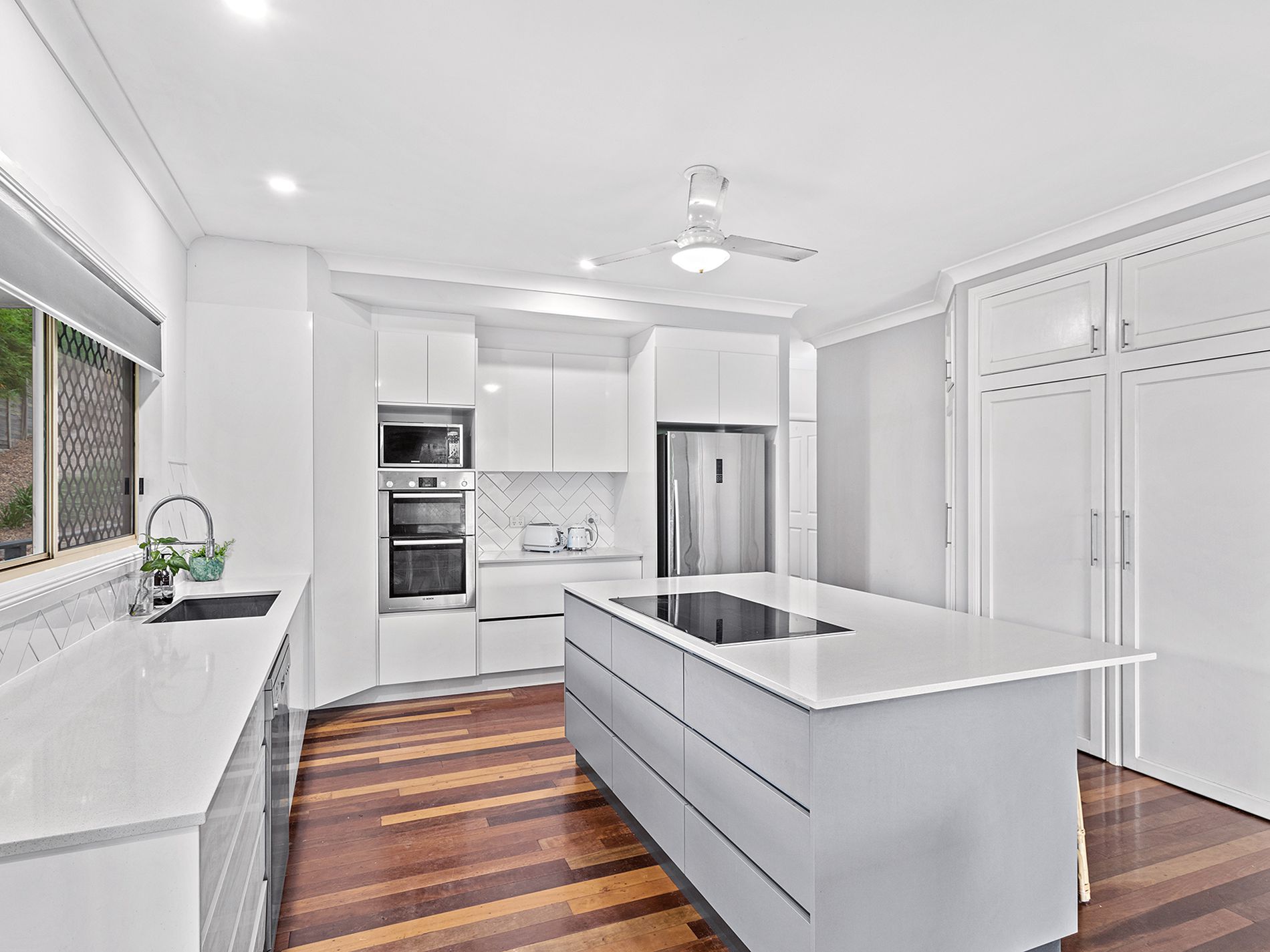 A kitchen for the chef or the whole family. Entertain effortlessly in the sleek, modern kitchen featuring classic white finishes, a striking herringbone-tiled splashback, oversized island bench, stainless steel appliances, and luxurious stone benchtops with an undermounted sink.